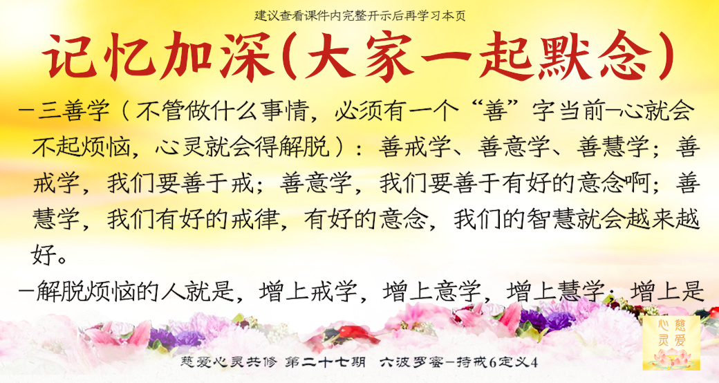 人要学三种:善戒学、善意学、善慧学。善戒学,我们要善于戒;善意学,我们要善于有好的意念啊;善慧学,我们有好的戒律,有好的意念,我们的智慧就会越来越好。所以今天有烦恼,并不代表明天也有烦恼,心情不好起烦恼,心就不能解脱,所以解脱烦恼的人就是,增上戒学,增上意学,增上慧学。什么叫增上啊,就是天天往上,天天在进步,意念,天天想好的啦,慧学,天天在增长智慧,你也进步了,明白了吗?