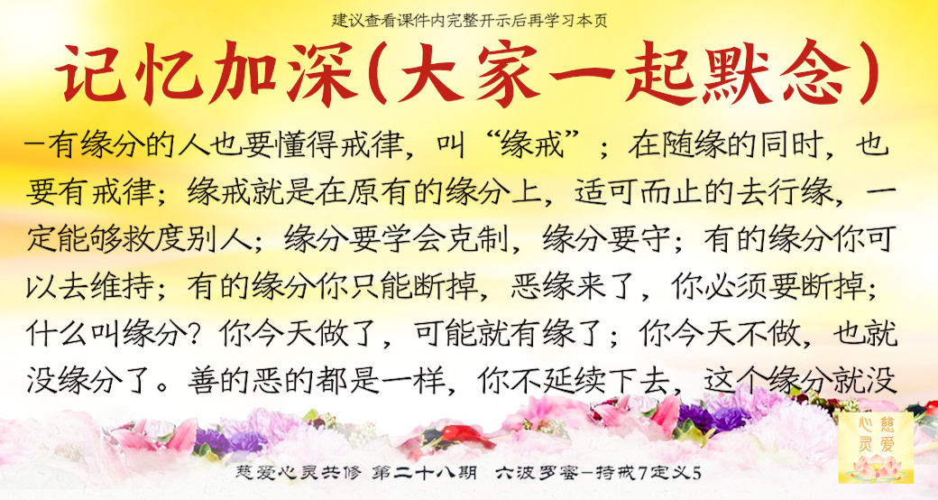 有缘分的人也要懂得戒律,叫“缘戒”。夫妻不是有缘分吗?如果你知道你太太是欠你的,你拼命地欺负她,那你一定会得到报应的。所以,在随缘的同时,也要有戒律。这个事情虽然给我这个机会了,但是我也不能用过头,我也要懂得戒,适可而止,中庸之道。大家要知道,缘戒就是在原有的缘分上,适可而止的去行缘,一定能够救度别人。如果你对别人随缘帮助好了,你是不是能够救度别人啊?如果你碰到事情想通、想开了,你不是对自己好了吗?你是不是自己能够救度自己?最后你才知道,原来是你自己救了你自己。想一想,你们现在学佛的人,是谁在救你们?是你们救了你们自己啊。如果你们不给自己这个机会,你们怎么可能学习到佛法呢?是你们自己救了自己,大家听得懂吗?