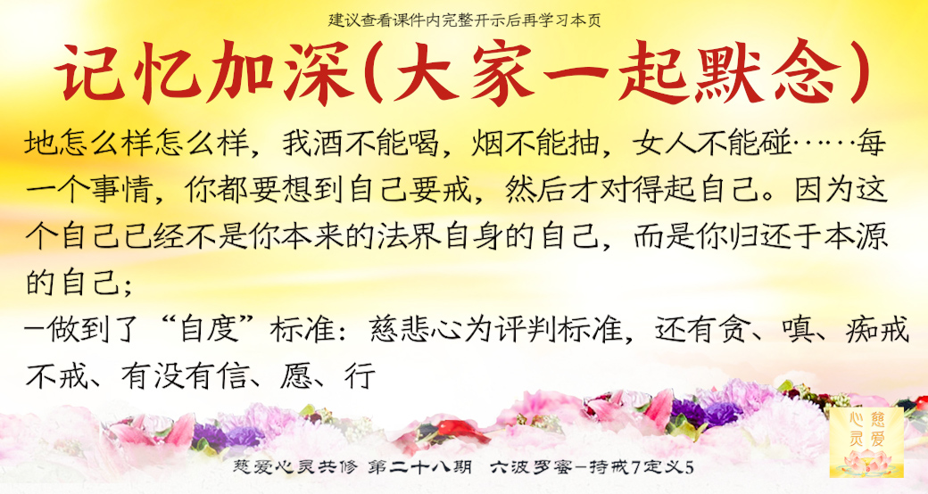 我们要自己度化自己,自己要给自己的戒律---就是克制。哪些我不能做的,哪些我可以做的,哪些我应该克制住,但是哪些我可以没有关系,慢慢地再改。人要懂得守戒,人要懂得自度。把自己度好了,你才能度别人。你自己不守戒,你怎么让别人来听你的话呢。你自己在家里不能以身作则的学佛,脾气改好,你怎么让你的先生、怎么让你的孩子会听你的话呢。
