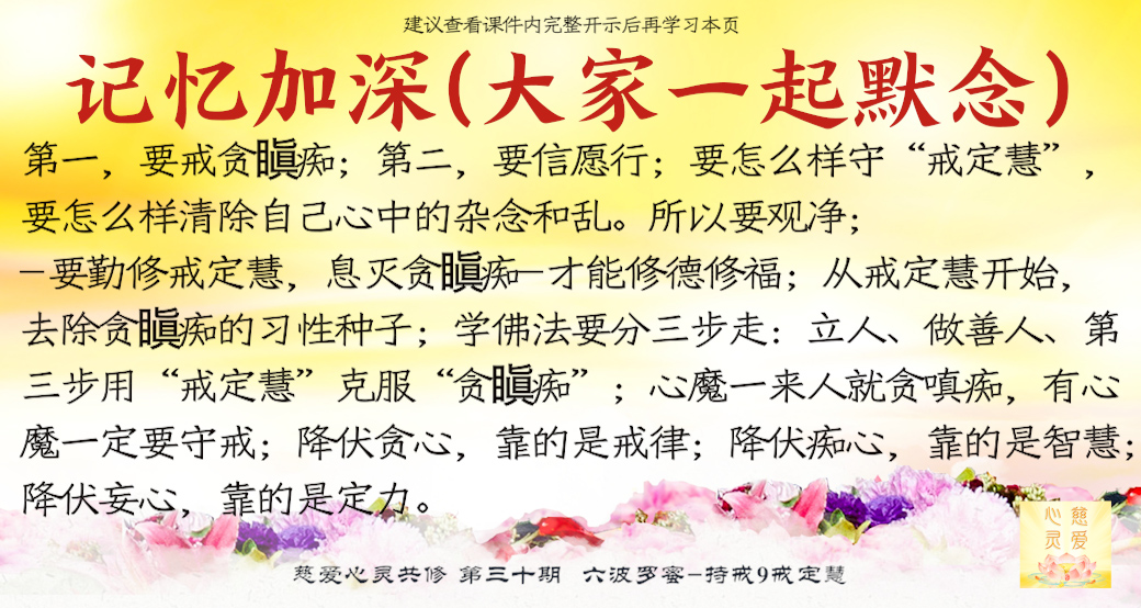 学佛法我们要分三步走:首先是“立人”。。。。然后第二步要做善人。。。第三步,要用“戒定慧”来克服自己的“贪瞋痴”。戒能克服贪,有贪心必须守戒。比如这个东西不该我拿我就不拿,我守戒了,我就戒掉贪心了。“哎哟,这东西好得不得了,人家都去拿了。”“我要守戒,我不去贪。”这“贪瞋痴”实际上就是用“戒定慧”来去除的。“定”能去除“瞋”。如果你有定力了你就不会去恨人家,你就能定得住自己。你觉得我没有必要去恨他,你觉得我没有必要跟他去发脾气,我没有必要……慧能去除痴。当一个人有智慧的时候他的愚痴就没有了。因为他明白了,他就不会去乱想了。愚痴就是乱想。比如说周阿姨想:“哎呀,我能活一百二十岁多好啊。”这就叫愚痴。“我不要活一百二十岁,我随缘,我早走晚走都是上天,我放得下。”这才叫真正的智慧。所有有智慧的人能够克服愚痴。愚痴是阻碍你前进的绊脚石,用现代的白话讲,就是想不到的去想,做不到的去做,这叫痴心妄想。