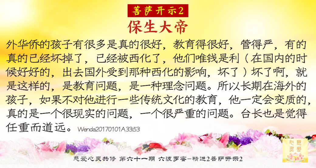 (不能听风就是雨,学佛学法就是简简单单,把佛法知识运用到你们的生活中就足够了,吃的上面以清淡为主,多多吃一些白菜,这都是对身体好的,还有胡萝卜,这都很好。不要吃刺激性大的食物,这样也是不好的,会给自己身体造成某方面的欲望,吃的上面大家也是克制一下,慢慢地就习惯成自然了。看看你们的师父多苦,清水的面条,他把爱都给了你们。你们一定要争气啊,他不求什么,只求今生能多带几个人回家,他把人间的欲望都放下了,他给予你们的是120%的能量支持。你们一定要争气,今生能冲出六道的人一定要跟好台长一起回家!时间不多了,很多的学佛人开悟的时候已经五六十岁了,时间还多吗?你们还有时间蹦迪吗?时间太少了,让你猛劲修你都不赶趟了,还不着急啊,你们师父真的心急啊,他老是说:‘如果我再早几十年像现在这么开悟我得度多少人啊!’但是您又有想过您的身体受得了吗?您为众生的辛苦,我们看在眼里疼在心里,我们知道您在人间受尽了苦难,但是您的心永远都只装着观世音菩萨和普天下的众生疾苦!您太累了,可您从来没有喊过停止,我们为您感动得涕泪横流!您为众生背了一身的业力,我们一定好好为您护法。今天您完成了观世音菩萨的大愿,我希望普天下的人也能够真心地跟随台长一世修成,今生你们说什么都要上去,不管是为了成佛还是为了众生,总之你们一定要争一口气,不要让菩萨为了你的出离再来人间!你们懂吗?跟住你们的师父,我作为台湾方的地神,我一定会好好护持心灵法门同修的,请台长放心。心灵法门天地感动,大家一定要好好跟随台长一世修成,不要再来轮回了,谢谢大家!)...一年过了,很多人又浪费了一年,但是我们学佛的人又精进了一年,我们又积功累德了一年。但是真的有很多人打麻将、赚钱……就是这么不停地消耗着自己的一些福德,有些人吃喝嫖赌、吃喝玩乐……实际上社会上随着开放,的确有一些西方的这种不好的东西给人间带来了很多的麻烦,很多人以为“哎呀,性开放了”,觉得过去怎么怎么,我们怎么,实际上他们害死自己了。现在性病流行,艾滋病横流,你想想看死多少人?过去毕竟没有这些病的,有些时候残害了多少妇女?为什么国家在禁止这些东西?不能让它蔓延,实际上很多人就借着改革开放,把资本主义的一些弊病都以为是好的。我们为什么要弘扬传统文化?就是要保护中国的这些正信正念,就是我们中华传统文化里面的仁义礼智信,这些都是非常好的东西,而不应该把那些垃圾文化一起吸收进来。有些时候会带来一些文化残渣,这些并不是一种纯的、正能量的文化,我们要保持中华五千年文化历史。为什么台长在不断地弘扬中国的传统文化和伟大的佛学精神?就是为了保持我们的正信正念,让我们的炎黄子孙、让我们的孩子、让这个世界上大家都能认清什么是正的,什么是不正的东西。现在的孩子,这个概念真的都不分了,尤其在澳大利亚,很多的孩子相互之间影响。在澳大利亚有一个省里面可以吸毒,很多人想吸毒,就赶到这个城里面,那个地方的法律就是可以吸毒的。你想想看,这个简直就是……这种法律你说你有什么办法?不是害人吗?所以现在很多学校里孩子都吸大麻。我们华人的子弟,中国的传统不能忘记!为什么我们要弘扬佛法?就是这个道理,就是让他们要懂得什么是正的,什么是邪的,因为已经直接影响到我们的生活了。我们海外华侨的孩子有很多是真的很好,教育得很好,管得严,有的真的已经坏掉了,已经被西化了,他们唯钱是利(在国内的时候好好的,出去国外受到那种西化的影响,坏了)坏了啊,就是这样的,是教育问题,是一种理念问题。所以长期在海外的孩子,如果不对他进行一些传统文化的教育,他一定会变质的,真的是一个很现实的问题,一个很严重的问题。台长也是觉得任重而道远。