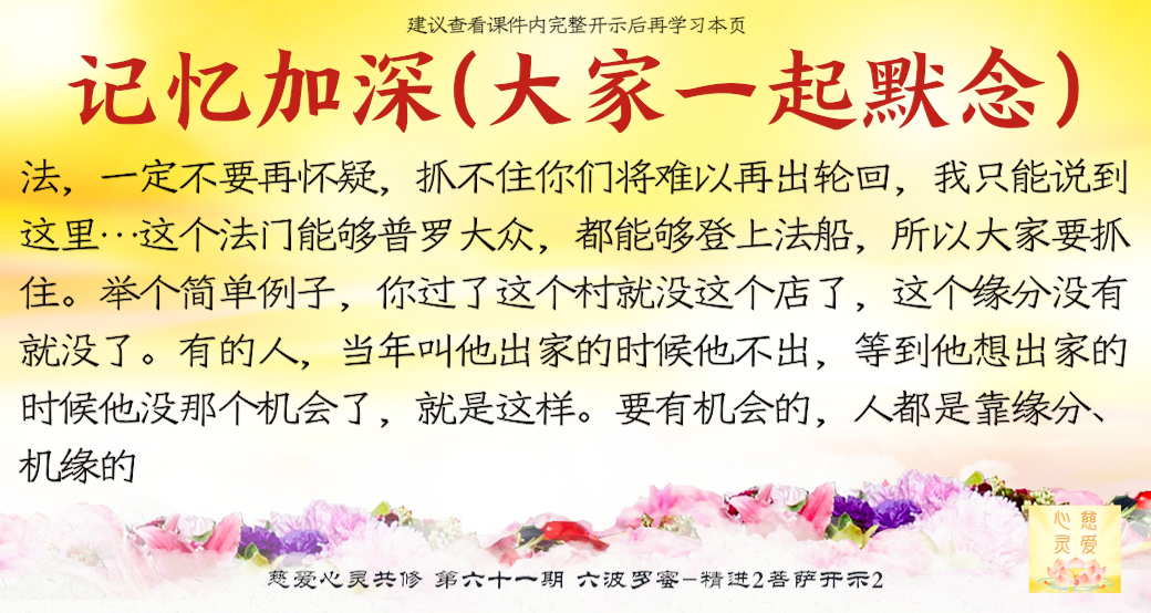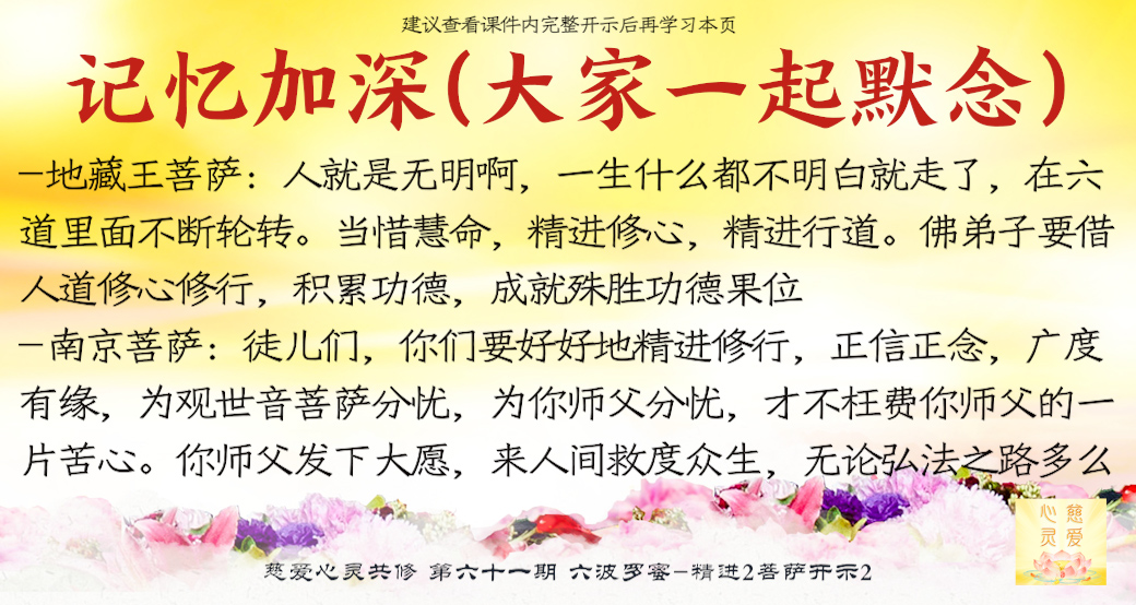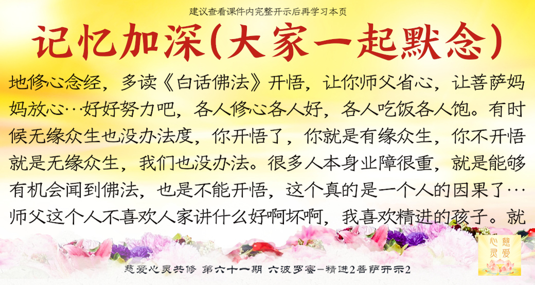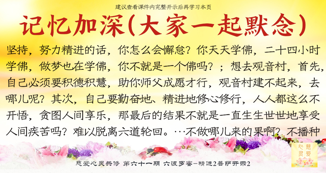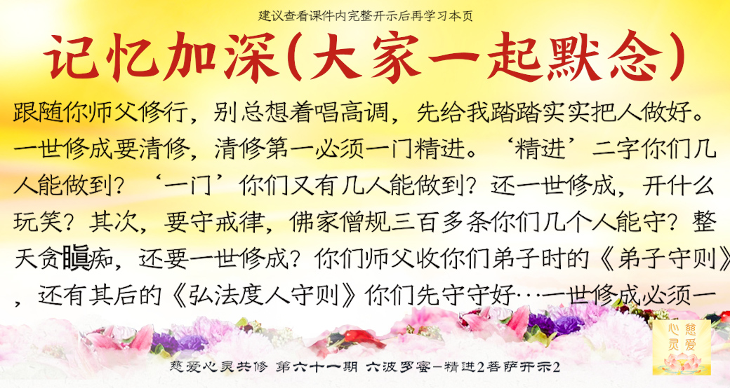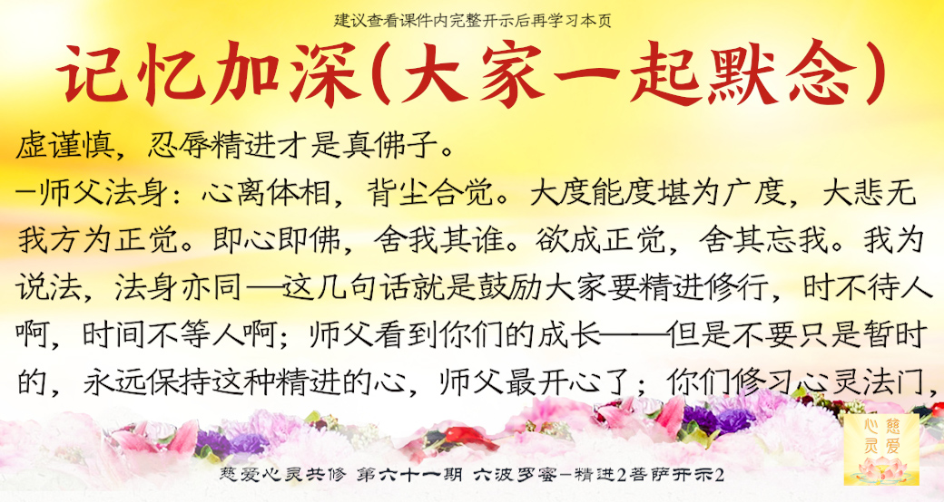 (“心离体相,背尘合觉。大度能度堪为广度,大悲无我方为正觉。即心即佛,舍我其谁。欲成正觉,舍其忘我。我为说法,法身亦同。”)但是师父后来也跟着观世音菩萨弄两句文言文,实际上这几句话就是鼓励大家要精进修行,时不待人啊,时间不等人啊