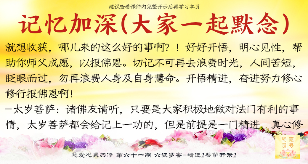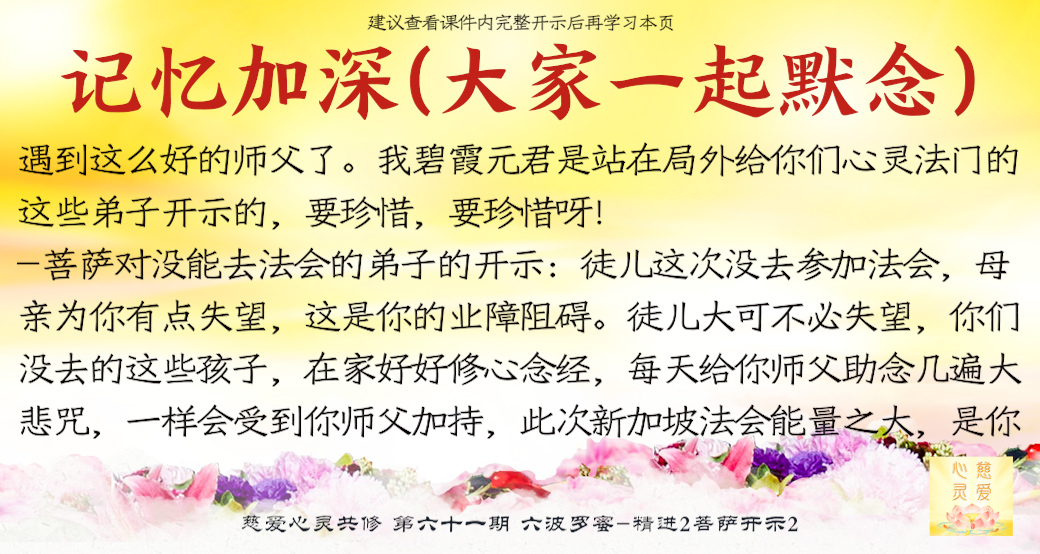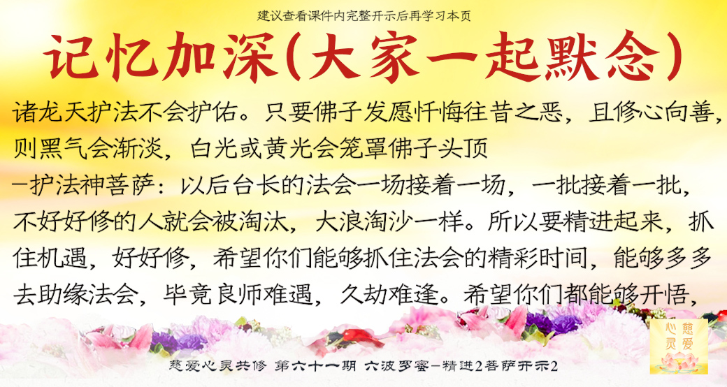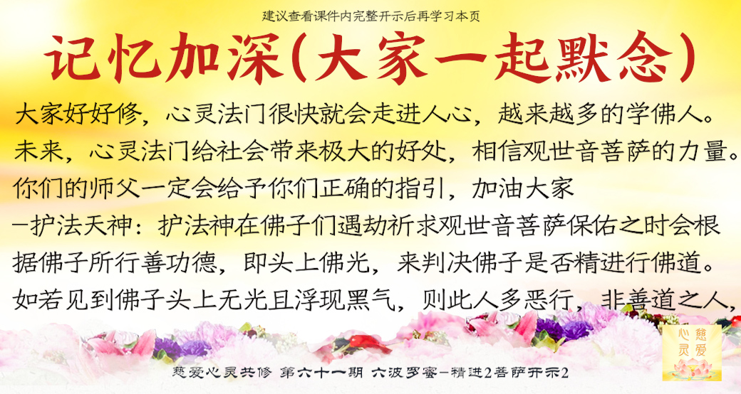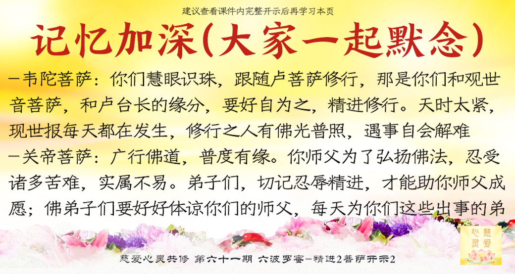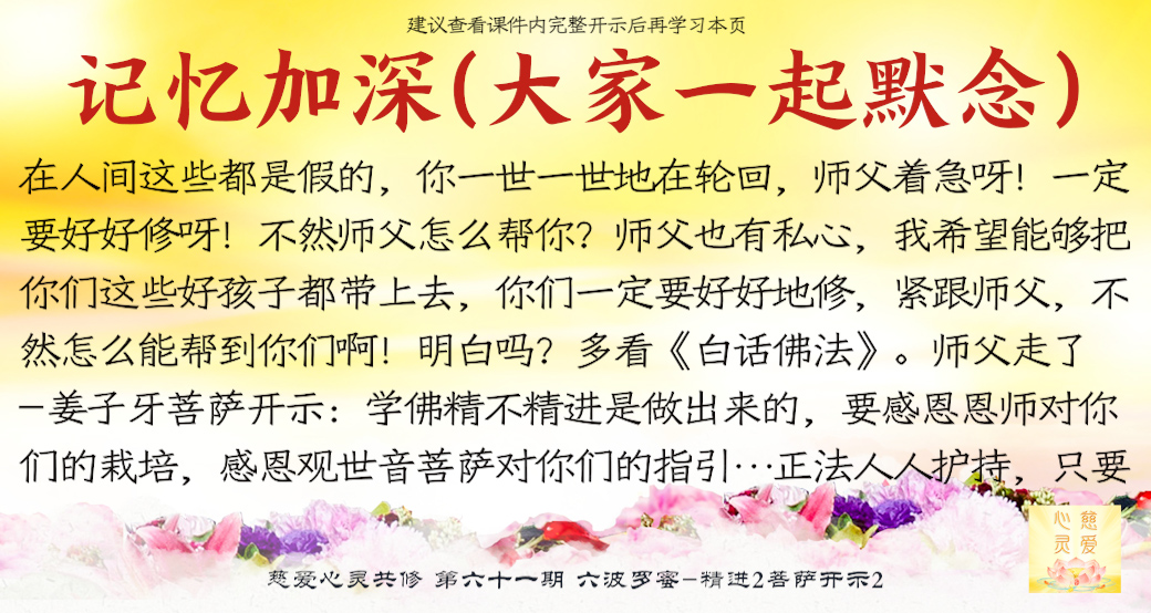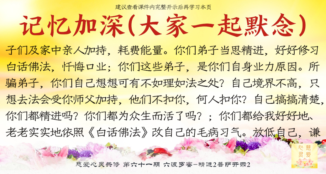 师父看到你们的成长——但是不要只是暂时的,永远保持这种精进的心,师父最开心了。很多弟子很诚心啊,真的感动天地啊。你们当中有很多都是有来历的,不要忘记自己最终的归属是在佛国净土、西方极乐世界的莲花池里,不是人间啊。感恩阿弥陀佛、观世音菩萨、大势至菩萨,感恩十方一切诸佛菩萨保佑。