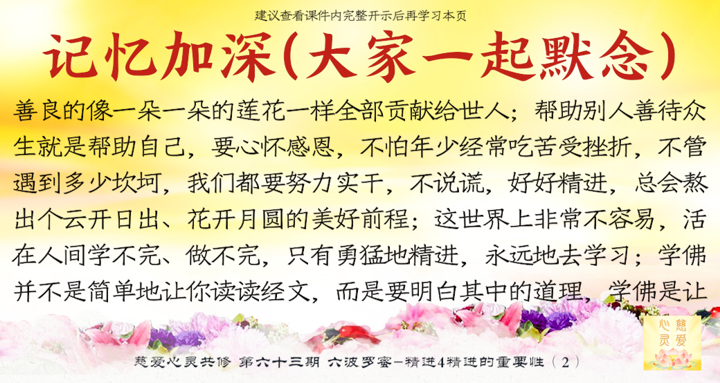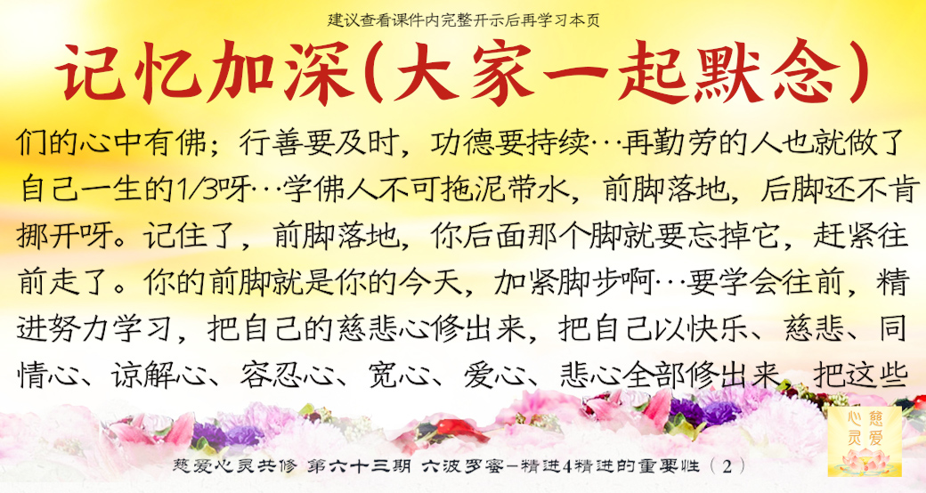 行善要及时,功德要持续,一个人几十年的生命,真正做人做事的时间很少很少,再勤劳的人也就做了自己一生的1/3呀!当你懂得人生真谛的时候,你会用你的智慧和毅力安排你的人生。这就是我们现在学佛人的人生,我们没有浪费,我们很开心。很多人不知道,一旦查出癌症了,医生告诉他只有三个月、六个月的时候,你知道他等于判死刑了,他才知道生命原来这么短给他。所以我们学佛人不可拖泥带水,前脚落地,后脚还不肯挪开呀。记住了,前脚落地,你后面那个脚就要忘掉它,赶紧往前走了。你的前脚就是你的今天,加紧脚步啊。你的昨天就是你的后脚,我们要把心专注在今天,而不能专注在昨天,否则你永远走不出来你的人生的坑坑洼洼的泥泞小道。所以要学会往前,精进努力学习,把自己的慈悲心修出来,把自己以快乐、慈悲、同情心、谅解心、容忍心、宽心、爱心、悲心全部修出来,把这些善良的像一朵一朵的莲花一样全部贡献给世人。让别人快乐的人你一定快乐,让别人难过的人你一定会伤心,你让别人瞋恨你一定会受苦。所以我们要学,我们真的要学,我们要制止自己心中的罪恶,我们要跟自己心中的恶念作斗争,积极地用善良的心念去改变自己。所以希望大家好好学佛,好好修心,希望大家能够在学佛当中认清人生的真谛,改变自己,让自己回到一个真我,学会真正地理解这个世界的真谛——那就是无常。