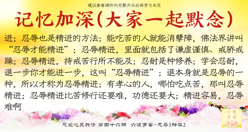 因为忍辱是作为一个方面,你忍辱了之后,也是一种精进,是这个概念。比方说,你今天家里吵架,你不能忍耐,家里就要打起来了,家具都砸光了,就要离婚了。那你今天能够忍耐,那么家里是不是越来越进步了?不吵架,家里是不是进步了?今天领导跑过来跟你说:“你不要这样做啊,你怎么怎么……”你忍辱:“是是是,领导,我一定改正。”领导马上说:“嗯,好孩子,进步了。”我们电台那些秘书处的小孩子,台长经常说:“你做错了,这个地方做错了,那个地方做错了。”他说:“师父,我做错了,我改。”“嗯,好,进步了。”那是不是忍辱了,精进了?(对)他如果跟我吵呢?“师父,我就不改”“师父,这个事情、那个事情……”找出千条理由万条理由,那你说他退步了啊,他不能接受人家的意见,明明自己做错,他都不能接受对自己的意见,你说是不是他做错了、退步了?还能精进吗?明白了吗?