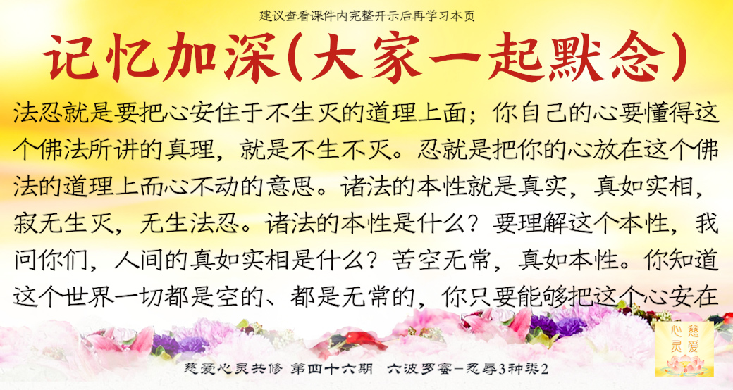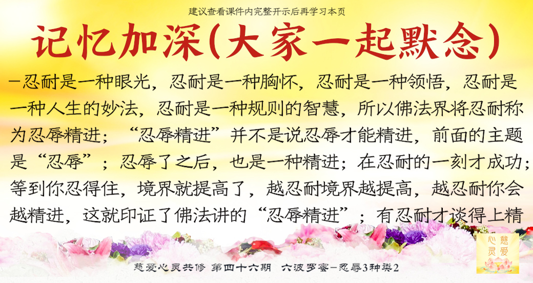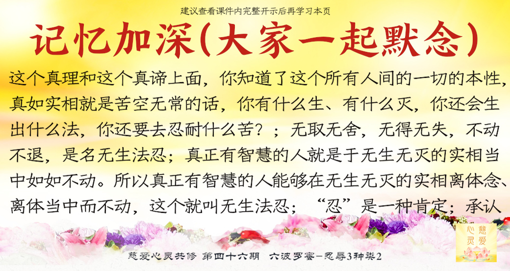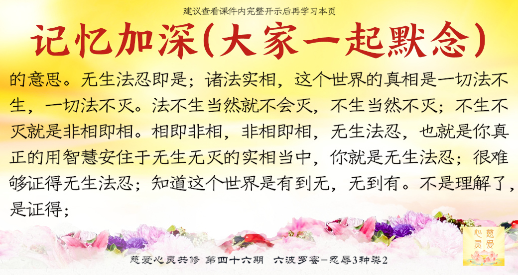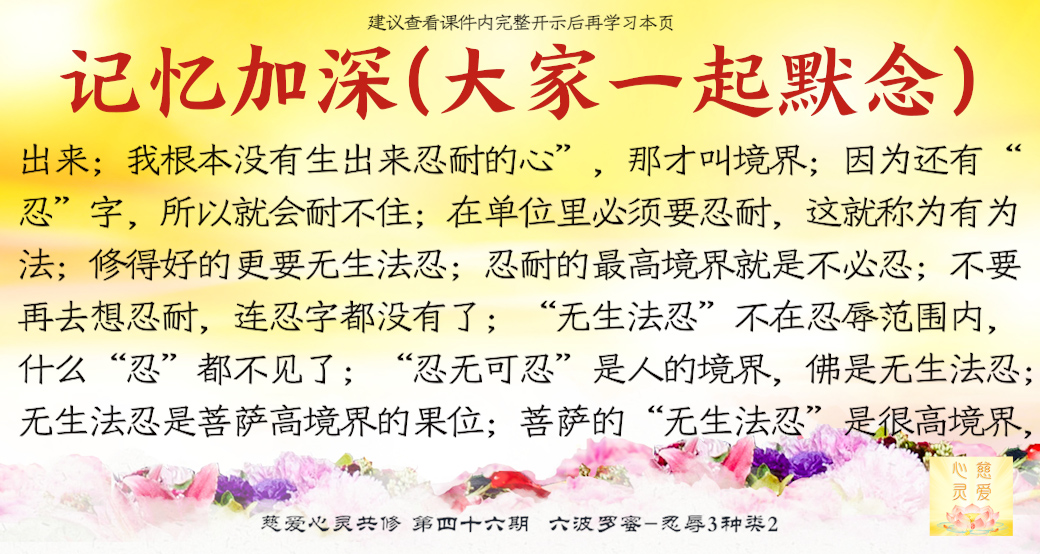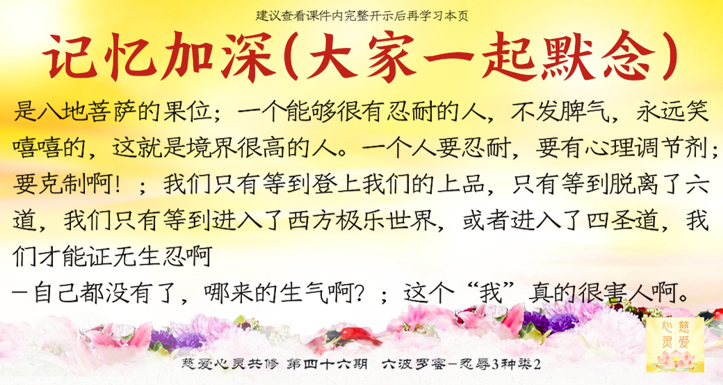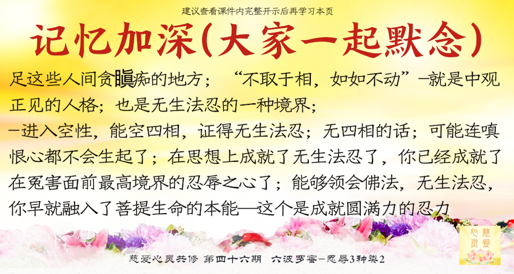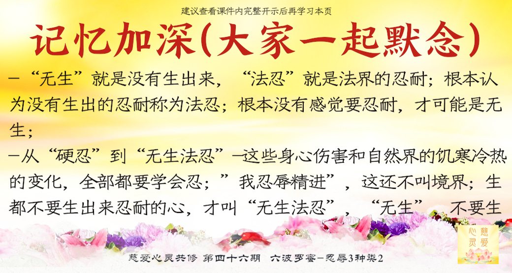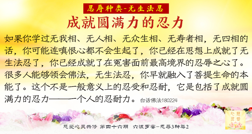 我虽然要忍耐,但是我连要忍耐的心都不生出来。根本认为没有生出的忍耐称为法忍。根本没有感觉要忍耐,才可能是无生。就是说,我没有感觉我要忍耐。很多人感觉自己要忍耐:“生气啊,不行,我一定要忍耐。我是学佛人,我必须要忍耐。你骂我好了,你打我好了,我就是要忍耐。”实际上这不是最高境界。你有本事,他骂你的时候你没有觉得他在骂你,他是在给你提高你境界的一个阶梯,就是一种增上缘,增加你上进的源泉。他给了你这个境界就让你进步更快。他骂你,你就听着,有则改之,无则加勉。因为在马路上还没有人来骂你呢。在家里他骂你,你就把他当成一种境界来看。这种忍耐实际上已经是一种法忍了,就是说没有忍耐的意思在里面。...师父让你们学佛就是放下自己,不要有面子。师父今天讲这个不好,讲那个不好,就是让你们学会忍耐。学到后来要无生法忍。阻碍境界提升是一堵墙。从某种意义上来讲,师父就是想把你们的这堵墙挖掉,因为你们的这堵墙把智慧挡住了。所以你就觉得痛了。