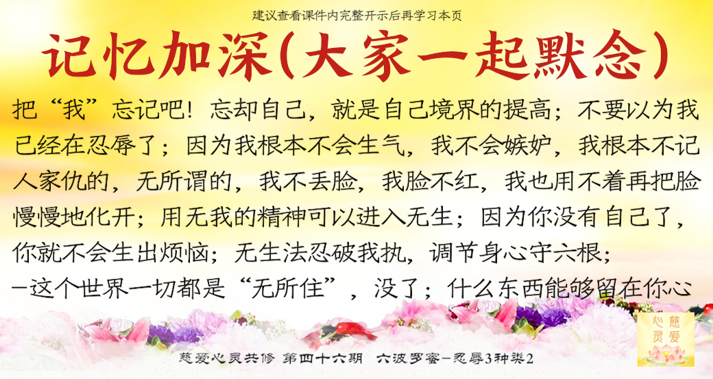 自己都没有了,哪来的生气啊?我不生气,因为我都没了。很多人的毛病就是“我不能够忍耐了,我受不了了。”这个“我”真的很害人啊。把“我”忘记吧!忘却自己,就是自己境界的提高。