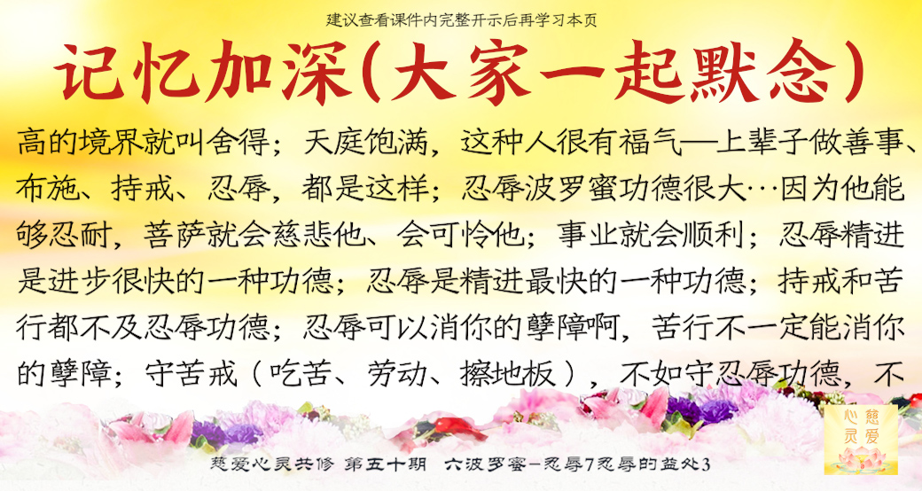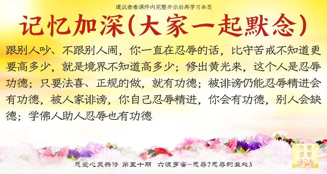 如果能够修忍辱波罗蜜的话,这个人功德肯定很大,因为他能够忍耐,菩萨就会慈悲他、会可怜他。你看唐僧到西天取经,观世音菩萨一直心疼他,一直在救他。如果唐僧今天跟孙悟空一样骂骂咧咧的,看见妖鬼就说:“你们这些人怎么怎么……”搞来搞去的话,你说观世音菩萨会像《西游记》里面这么关心他吗?(了解,就是忍辱可能有更多功德了。我们有两个人同样都是做功德,一个人的心比较清净,所以他的功德成就更加大)对了,就这么简单。同样两个人做好事,一个人做了好事之后,蹦蹦跳跳地到处去讲,做事情的时候嘴巴里骂骂咧咧,和一个人不声不响地做好事,一件事情做好了,你说哪个人功德大啊?