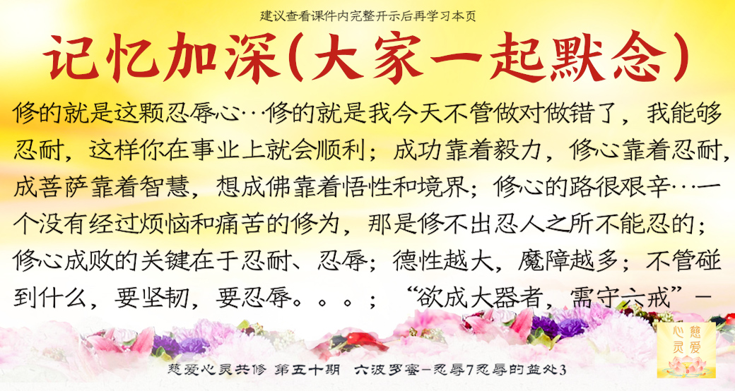 修心当中总会碰到阻碍、烦恼和业障,怎么样来忍耐?人家诽谤你、阻碍你,你不能有怨气,不能发怒,因为不怨、不怒,实际上第一个关键就是由忍辱开始,所以有一句话就是“由忍化恕”,先有忍耐,然后转化为宽恕别人,你宽恕了别人之后,你心自安。忍辱还不是最高境界,学会化解忍辱才能不生忍辱心。很多人非常恨自己的老公,恨自己的老婆,实际上就是你没有宽恕对方,一旦你原谅宽恕了对方,你就会自己感觉到安全了。