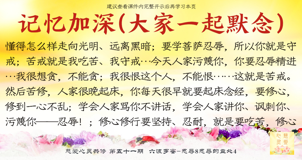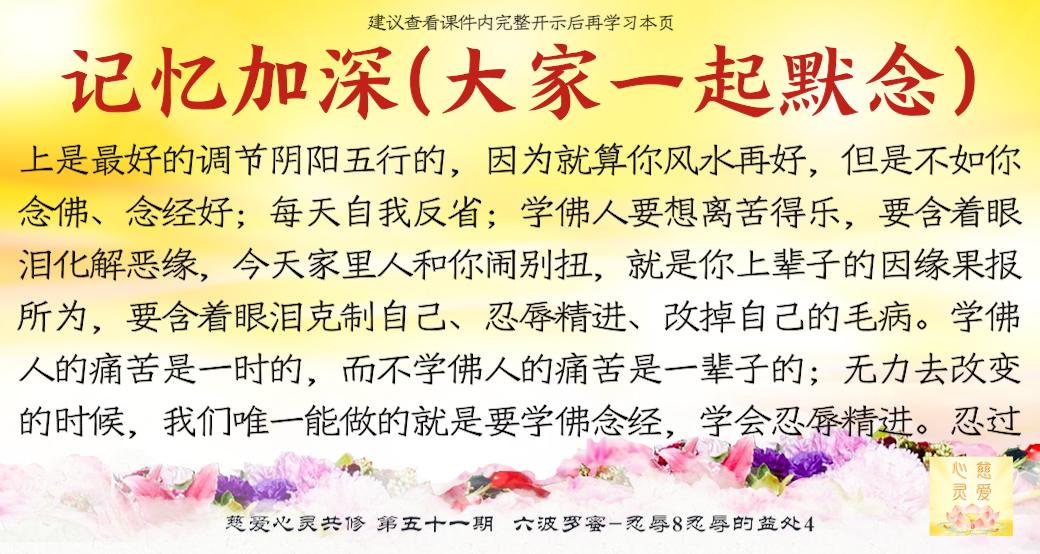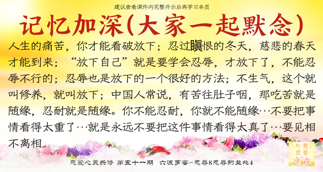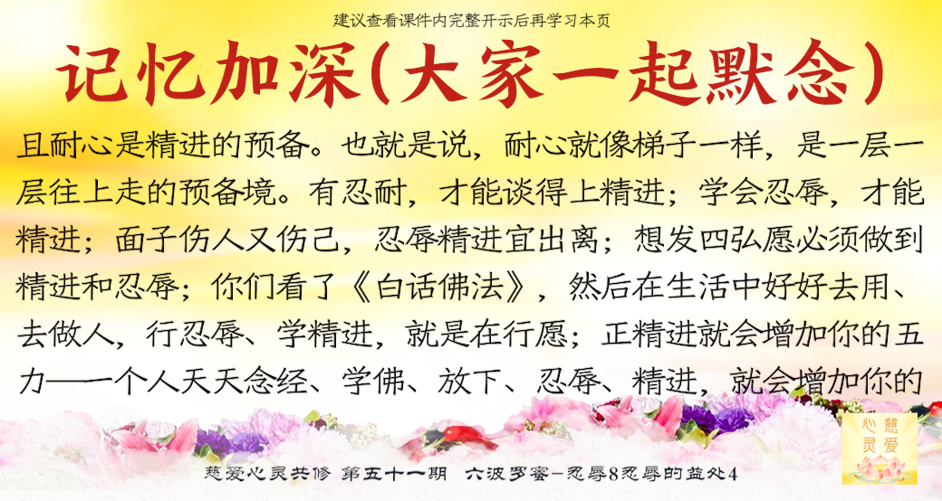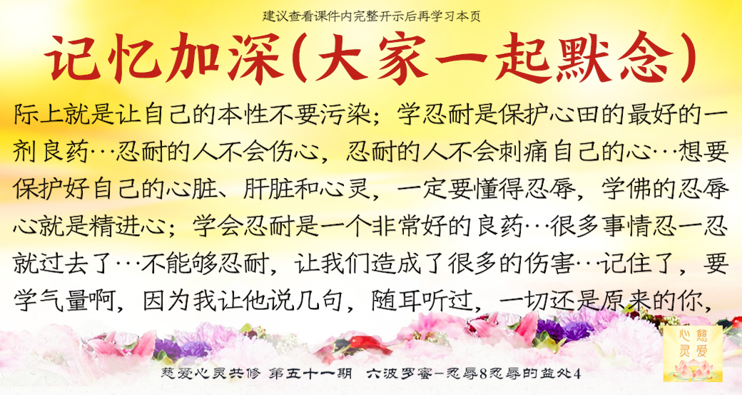 忍耐的人不会伤心,忍耐的人不会刺痛自己的心;不能忍耐才会失守,不能忍耐才会骂人骂到别人的祖宗。要学会珍惜,要懂得忍辱精进。想要保护好自己的心脏、肝脏和心灵,一定要懂得忍辱,学佛的忍辱心就是精进心。