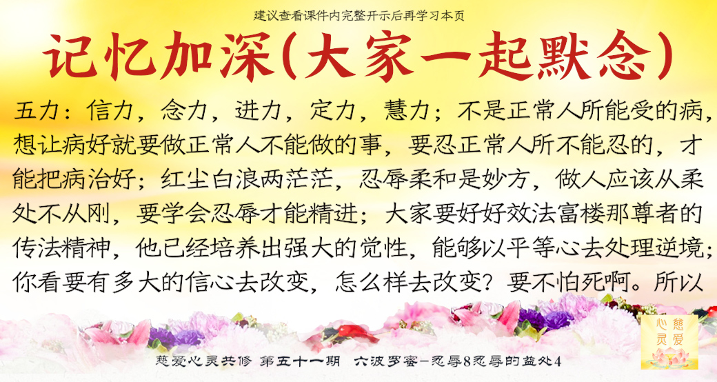 学佛五力:2)进力,进取的力量。...如果什么东西都去学一学,什么事情都不会成功。进力还要加一个勇猛向前,就是要精进修。比如:如果得了重病,要多念《大悲咒》等经,因你现在受的不是正常人所能受的病,想让病好就要做正常人不能做的事,要忍正常人所不能忍的,才能把病治好。