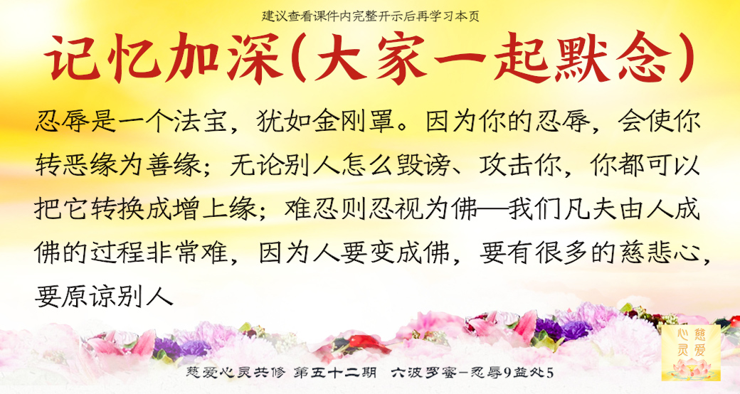 我们完整的本性因恨别人而被污染,别人的因果自己受,我们不能用别人的错误再来伤害自己已经很痛的心。原谅别人、不憎恨别人,就是智慧,就是忍辱波罗蜜。