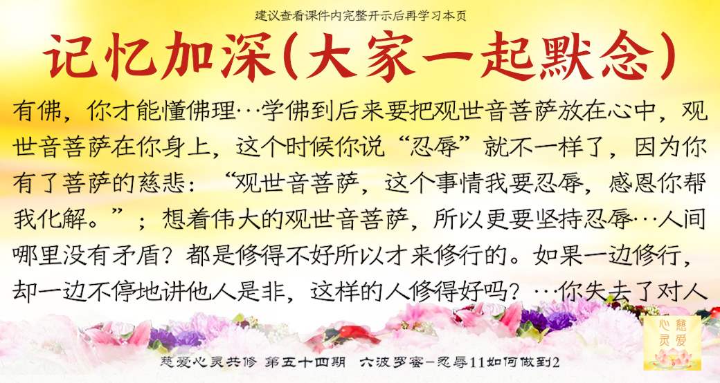 因为你没有佛的忍辱,你不能开悟,所以你到最后憋不住了,会跟他吵架打起来。学佛到后来要把观世音菩萨放在心中,观世音菩萨在你身上,这个时候你说“忍辱”就不一样了,因为你有了菩萨的慈悲:“观世音菩萨,这个事情我要忍辱,感恩你帮我化解。”想一想,菩萨碰到事情怎么会生气呢?菩萨会觉得他很可怜,会帮助他化解怨结,这样的话两个人就不会吵架了。