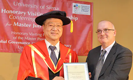 2014年4月1日 – 盧臺長荣获意大利锡耶纳大学(University of Siena) 「荣誉客座教授」殊荣。文化外交机构主席马克先生、前奥地利副总理布赛克先生、赛普勒斯前外交部长柯萨瑞古利斯女士和锡耶纳大学科学学术理事会主席、维智伽利教授代表校长,参加了这一庄严隆重的颁奖典礼