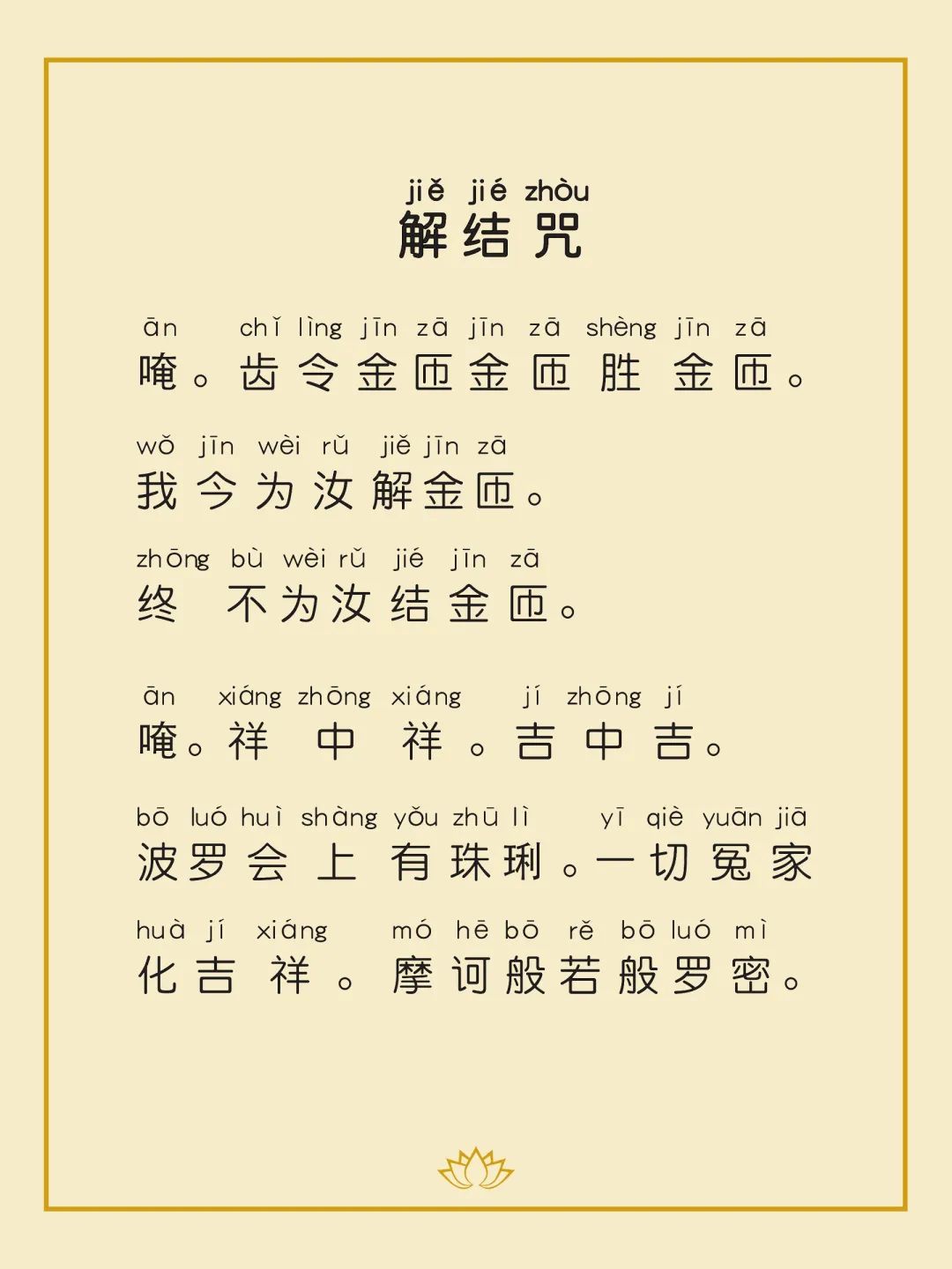 《解结咒》是请大慈大悲的观世音菩薩帮助我们化解人与人之间的冤结。其中的一种功能适合:恋人误会、夫妻不和、父子母子不睦、同事纠葛、老板职员对立、前世孽障。